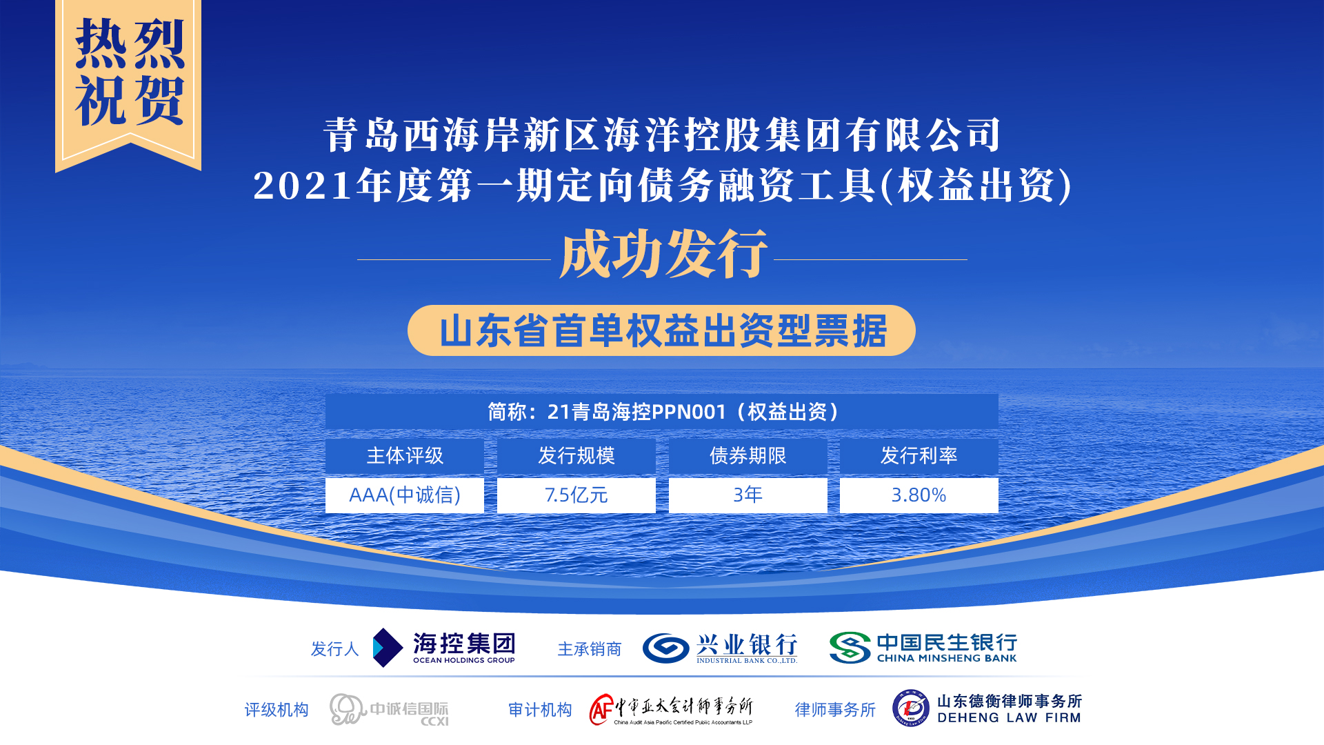 近日,“青島西海岸新區海洋控股集團有限公司2021年度第一期定向債務融資工具(權益出資)”成功發行,發行金額7.5億元,期限3年,為山東省首單權益出資型票據。