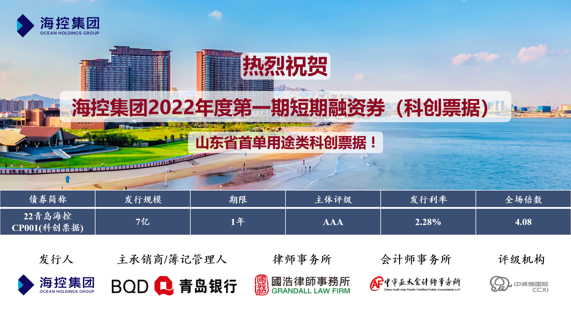 近日,海控集團“2022年度第一期短期融資券(科創(chuàng)票據(jù))”成功發(fā)行,期限1年,發(fā)行金額7億元,認購倍數(shù)4.08倍,發(fā)行年利率2.28%,為山東省首單用途類科創(chuàng)票據(jù)。資金主要服務于青島京東方產(chǎn)業(yè)生產(chǎn)基地和海洋生物醫(yī)藥產(chǎn)業(yè)園區(qū)等科技創(chuàng)新項目建設。