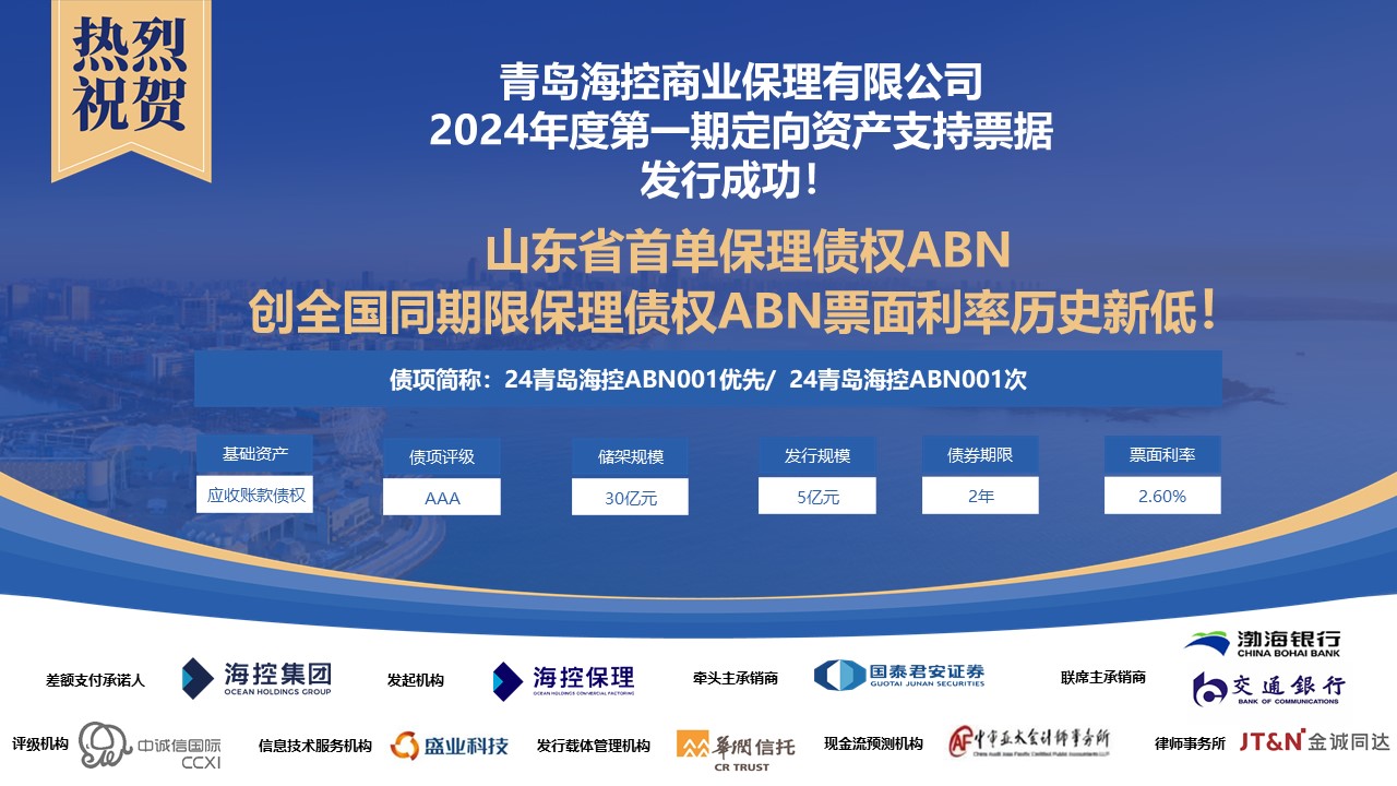 6月18日,青島海控商業(yè)保理有限公司(以下簡稱“海控保理”)2024年度第一期定向資產(chǎn)支持票據(jù)(ABN)成功發(fā)行,是山東省首單保理債權(quán)ABN。該產(chǎn)品發(fā)行規(guī)模5億元,期限2年,票面利率2.6%,創(chuàng)全國同期限保理債權(quán)ABN票面利率歷史新低。