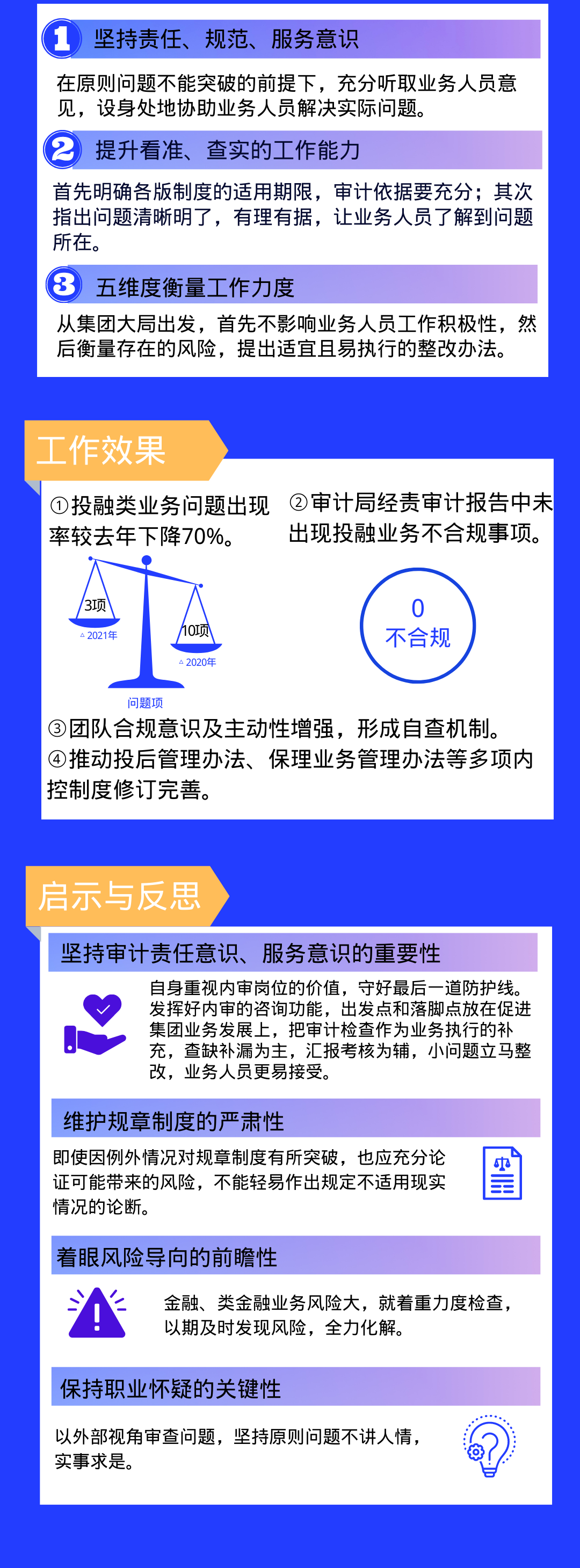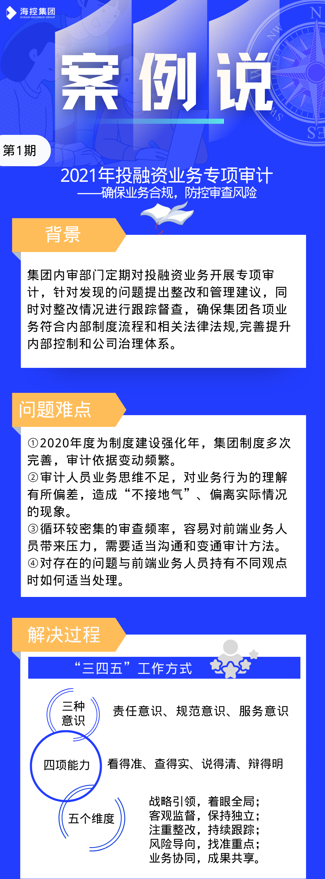 案例說 | 2021年投融資業務專項審計 2022-06-08 17:24:42 透過不同業務層面的工作案例,汲取優秀經驗的源頭活水把從經驗中獲得的觀察進行擴大發揮案例的杠桿效應幫助每個人加速提升推動集團業務發展~??丶瘓F“案例說”欄目上線啦!先睹為快▼